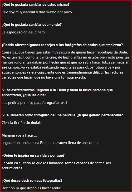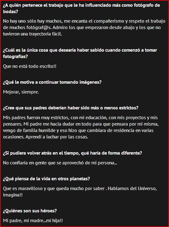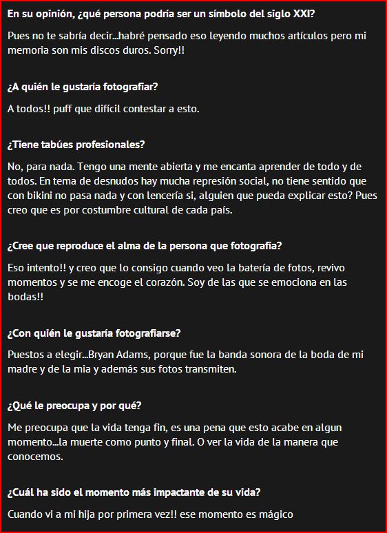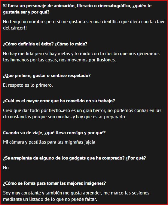 Al principio las preguntas parecían pocas pero la cosa se puso extensa y yo me dejé llevar, haciendo ameno el interrogatorio!! jajaja y aquí os la dejo para que le echéis un vistacillo. Para mi, un honor que reconozcan mis fotos y mas cuando es a nivel internacional. Una trayectoria que espero esté sólo empezando, gracias a todos por hacer de cada momento un pasito más a mi meta en este proyecto.