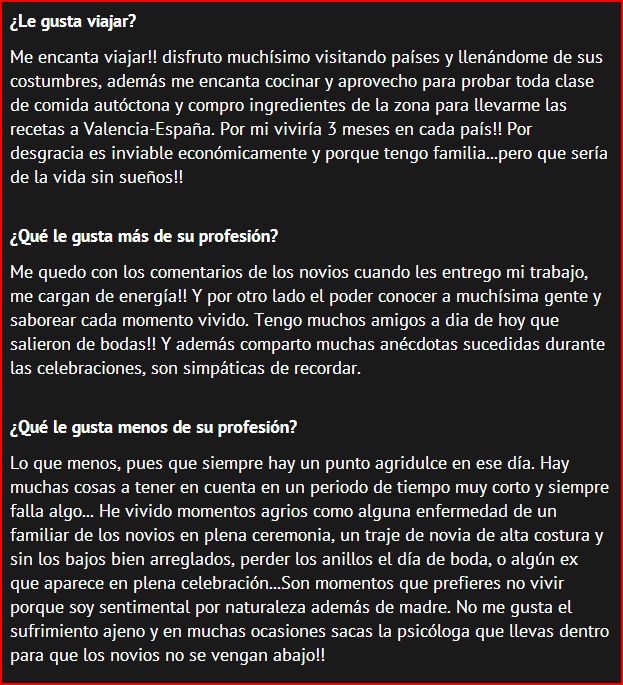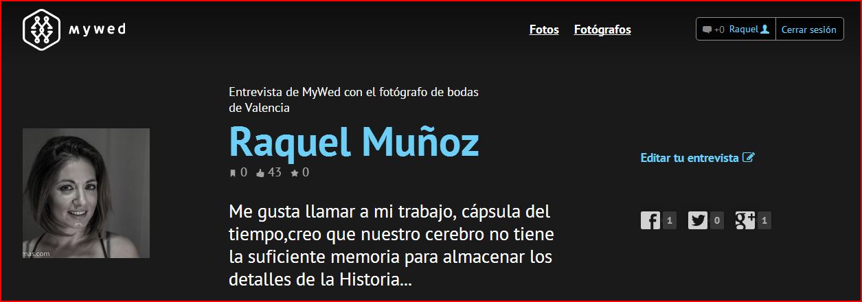Hoy la entrada se la dedico a la entrevista que me hicieron el equipo de My Wed, web de fotógrafos de boda a nivel internacional el mes pasado y de la que formo parte desde hace unos años. Me sorprendió que decidieran realizar una entrevista a mi, como fotógrafa pero confieso que me encantó!! Contenta es poco la verdad.